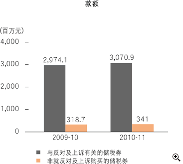 在2010至11年度,「电子储税券」计划的买券数目和款额较上一年度分别增加5%及10%,但「即赚即储」计划则分别减少2%及1%(