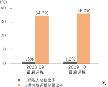2009至10课税年度按标准税率缴税的人士有22,407名,较上年度的21,140名增加1,267名。他们所缴纳的税款约占薪俸税评税总额的36.0%,较上年度的34.7%为多(