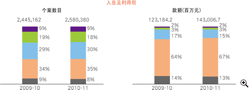 税务局就不同原因退还税款给纳税人,例如纳税人多缴应付税款,或因修订评税而须退还税款。2010至11年度退税个案达523,164宗,较去年增加了2.4%。退税款额为107亿元,较去年增加了4亿元,增幅3.9%(