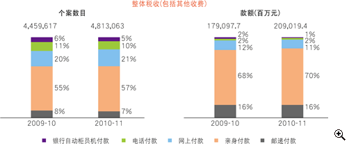 税务局提供多种缴税方法供纳税人选择,包括电子付款(电话、银行自动柜员机或互联网)、亲临付款或邮寄付款。电子付款方法广为市民使用。就入息及利得税而言,2010至11年度以电子方式缴税的宗数占总数的57%,较去年同期增加7万4千宗(5%)。