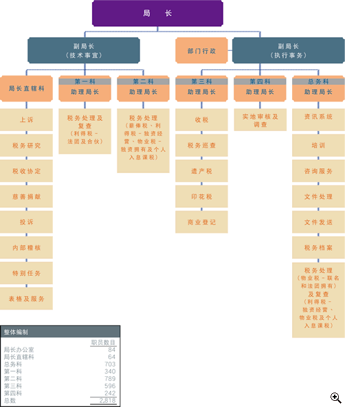 截至2011年3月31日,本局的编制共有2,818个常额职位(包括25个首长级职位),分布于局长办公室和六个科别。属部门职系人员(即评税主任、税务主任及税务督察)的职位有1,820个,负责处理税务事宜;其余998个职位属共通/一般职系人员,他们为本局提供行政、资讯科技和文书的支援(图36)。